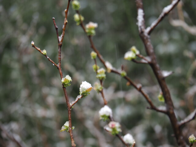 黄緑色の新芽が出てきていた花梨の木にも雪が