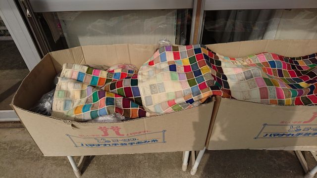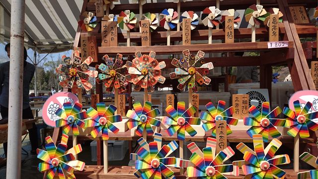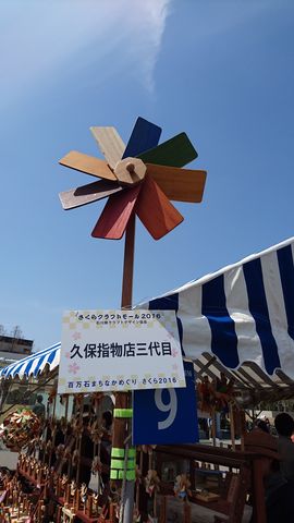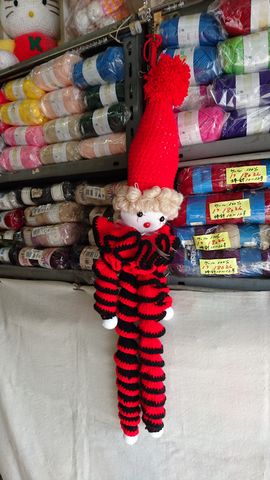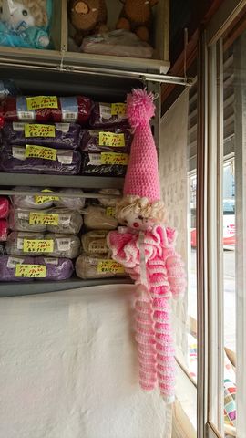 お店の外に売っている毛糸の上にこんなカラフルなものが...日よけです。