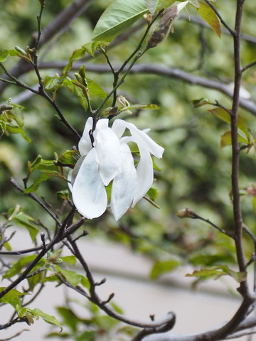 白いハンカチを引っかけけたようなお花が咲いている木が...