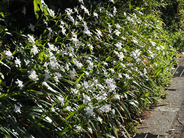 ムラサキナバナが両脇に咲き乱れて