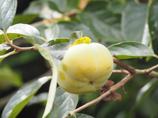まだ緑色の柿の実を見つけました。