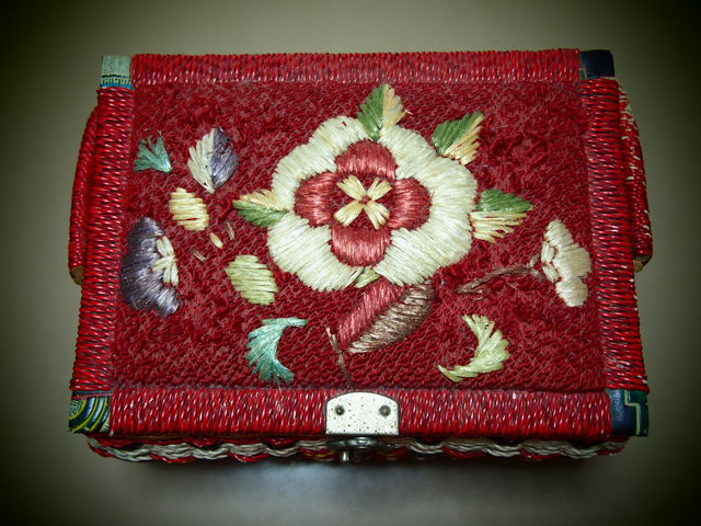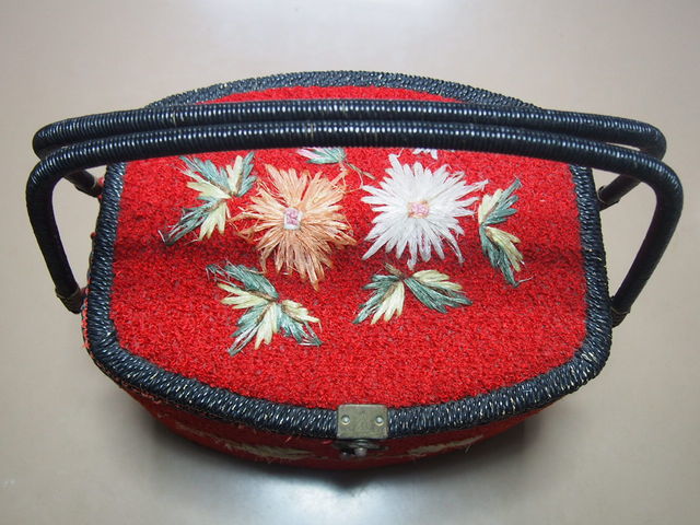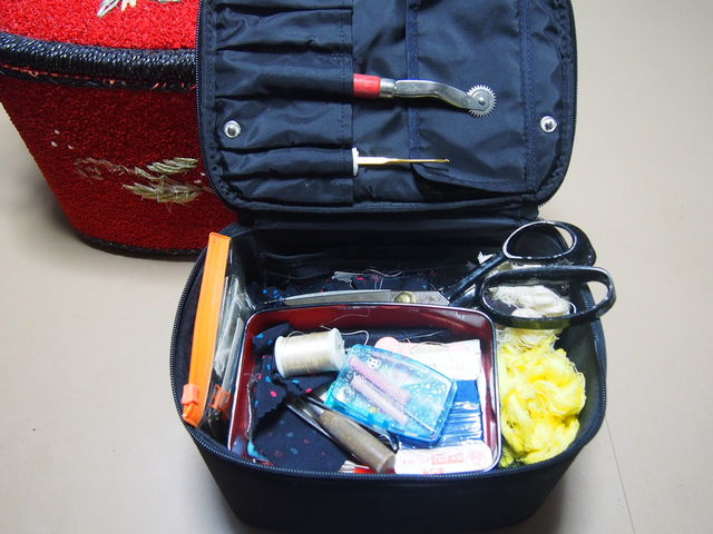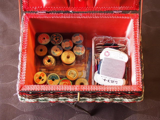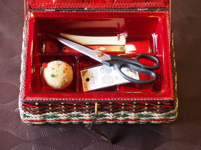 元気が出る赤のお裁縫箱を手元に置いて